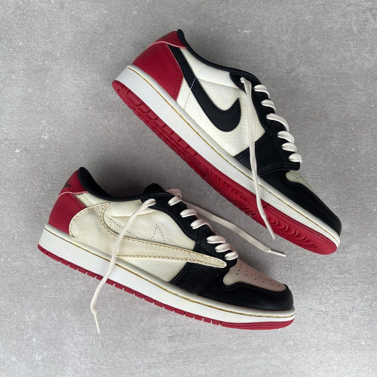 Custom JORDAN 1 low black toe full customized in a vintage effect with a reverse swoosh added.