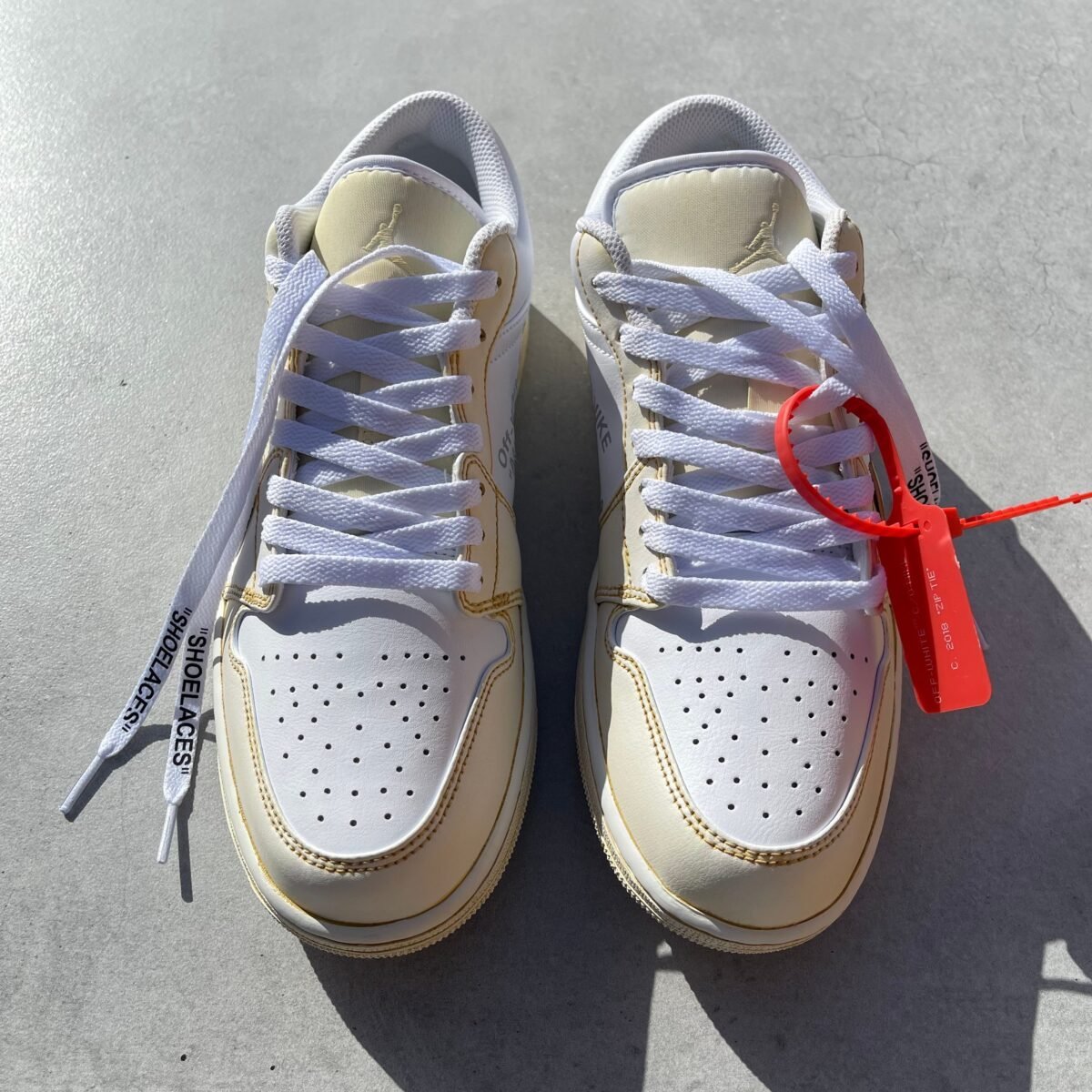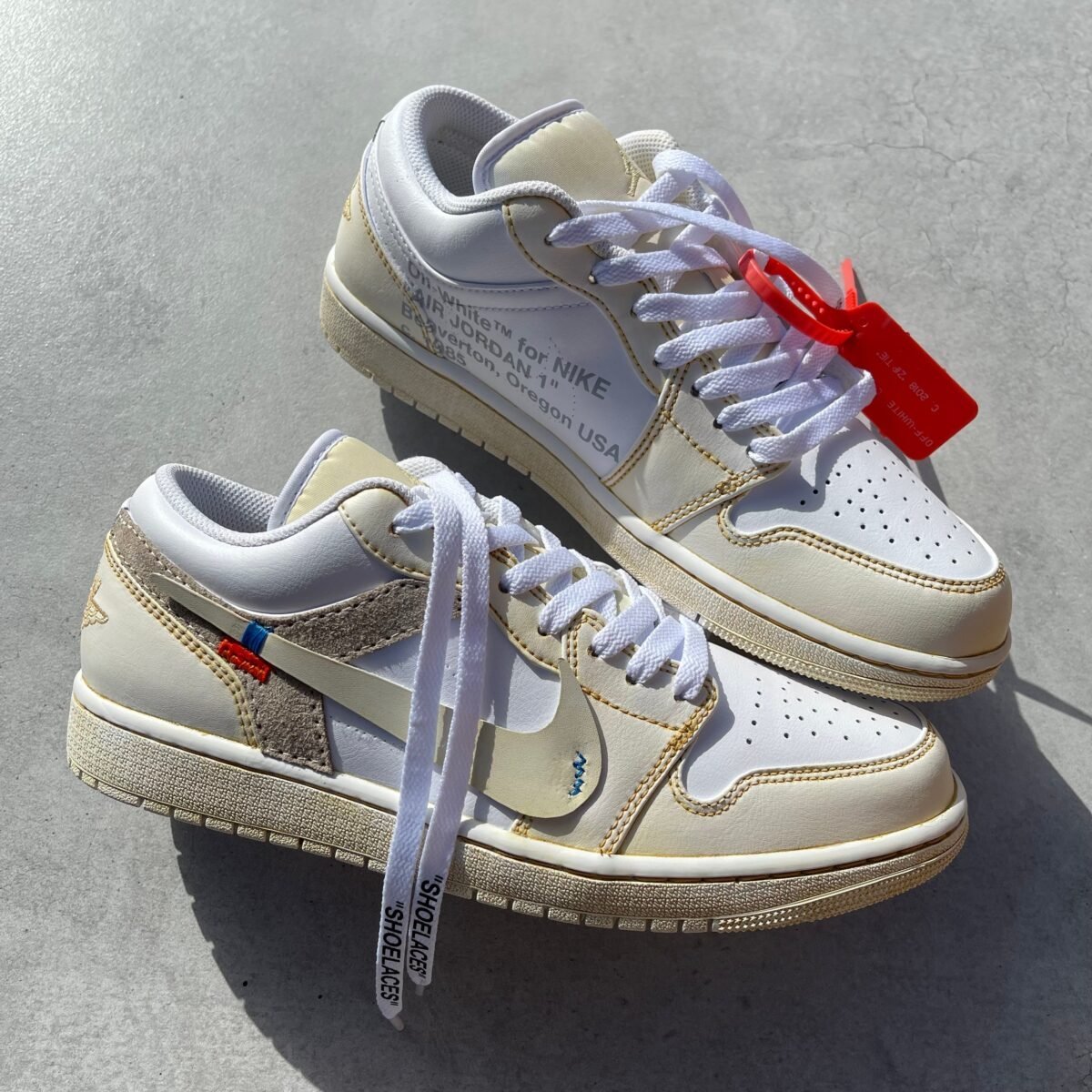 Custom JORDAN 1 low in OFF WHITE style. We changed parts of the shoes into a vintage colourway. Added the OFF WHITE texts on the insides and sewn on a OFF WHITE style swoosh on the outsides.