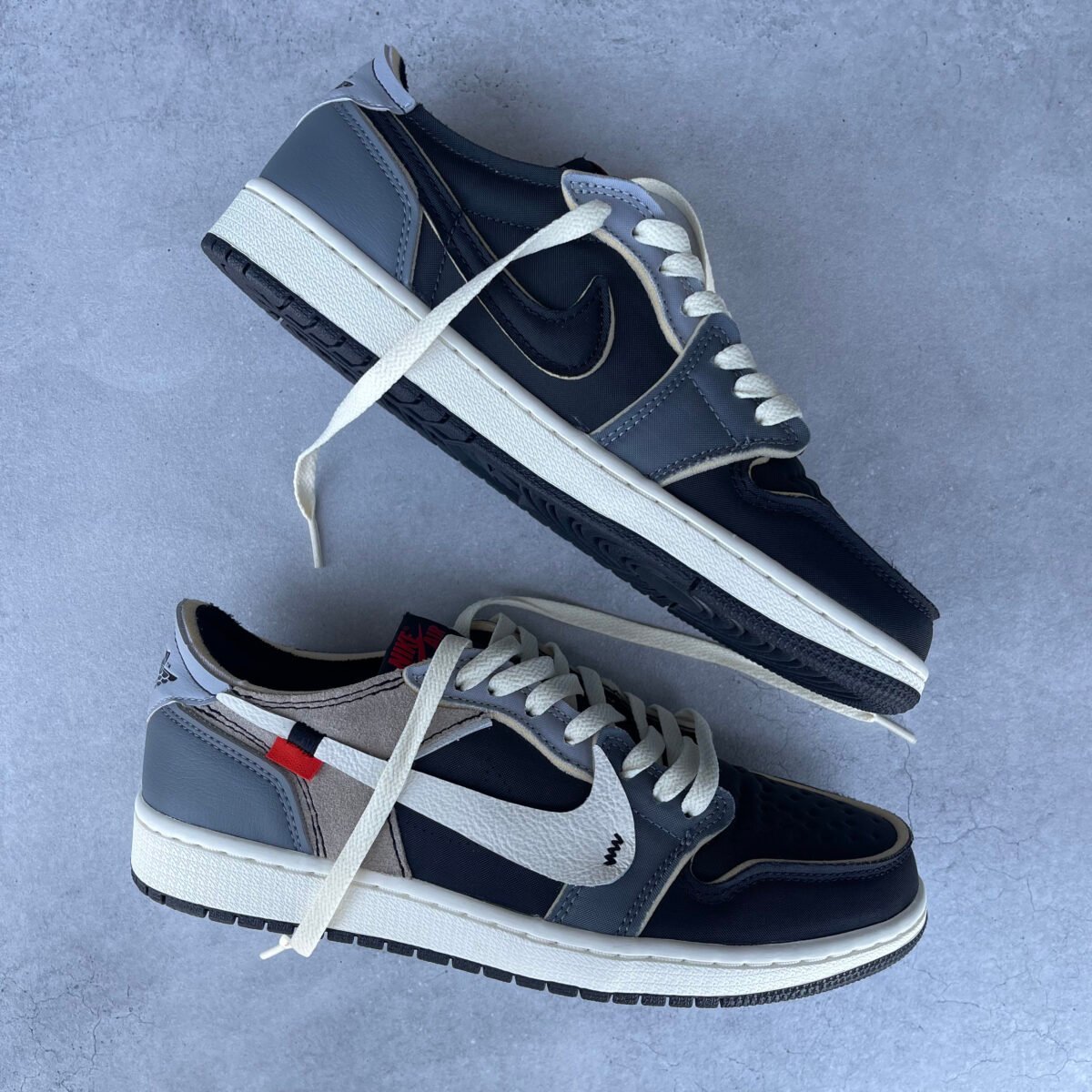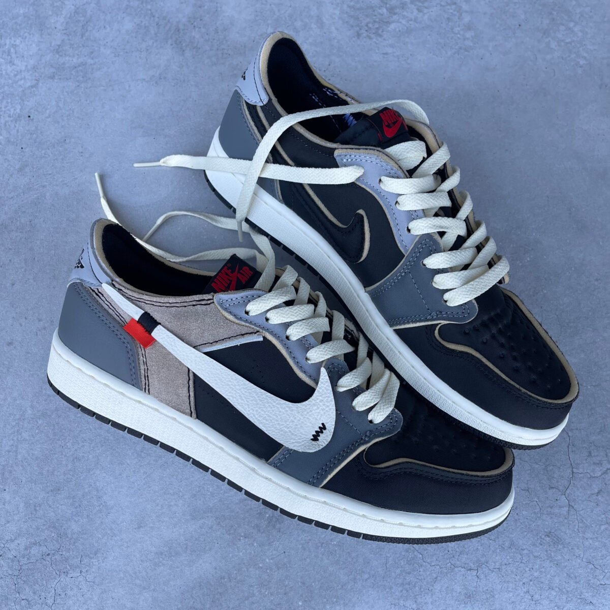 Custom JORDAN 1 low OG Ex grey in OFF WHITE style. Sewn on a OFF WHITE style swoosh on the outsides. Also replaced the label on the tongue to the outsides of the tongue