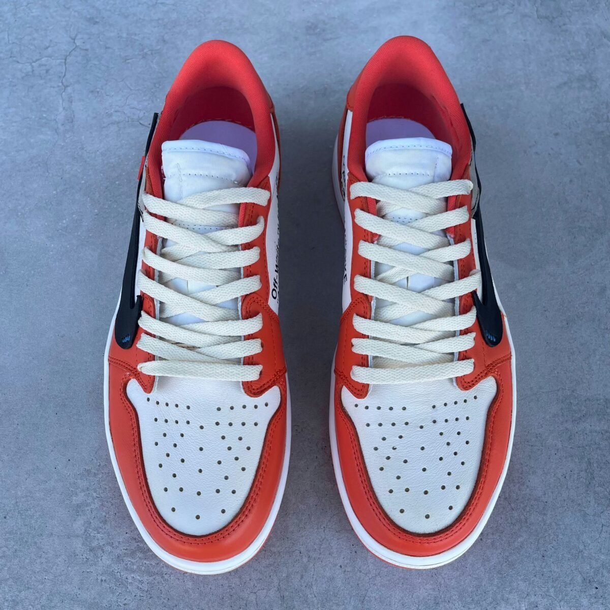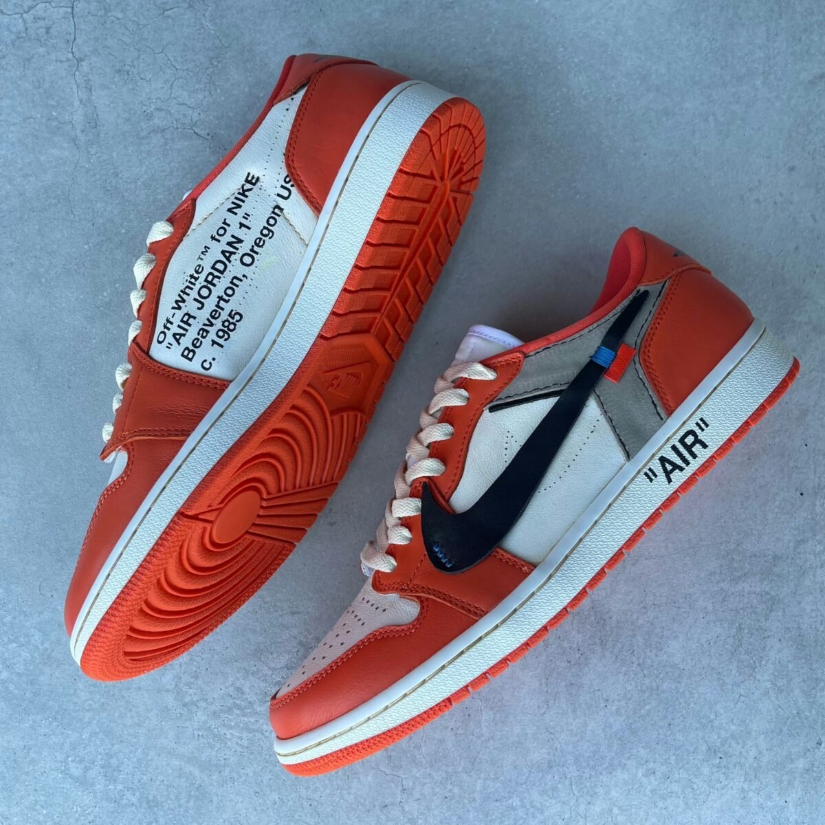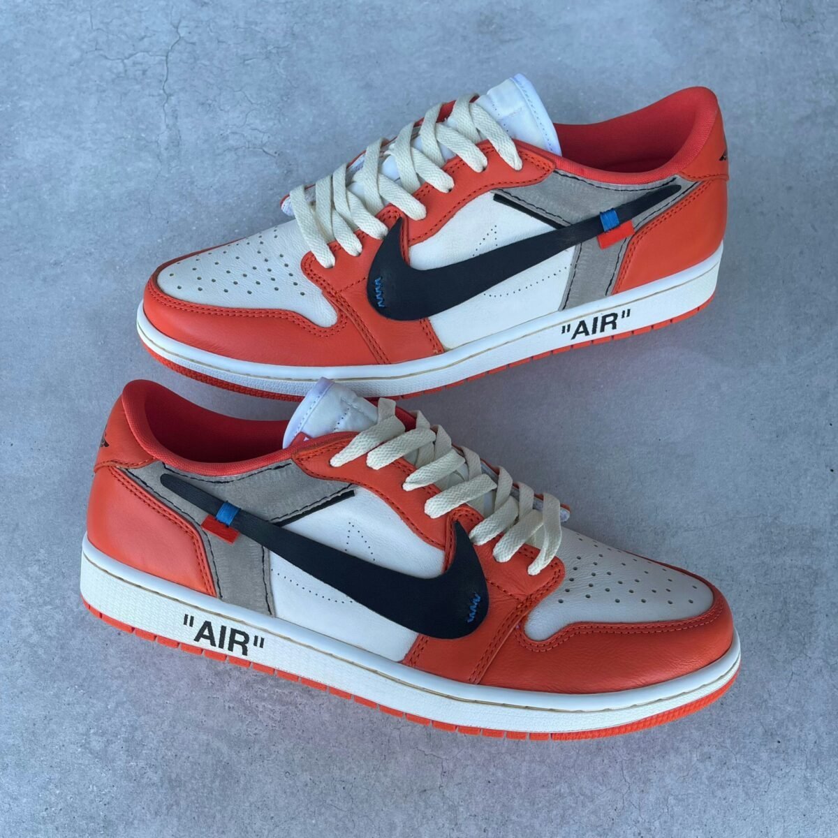 Custom JORDAN 1 low OG Starfish in OFF WHITE style. Sewn on a OFF WHITE style swoosh on the outsides. On the insides we added the OFF WHITE text.