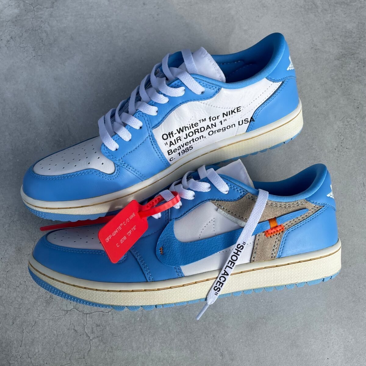 Custom JORDAN 1 in OFF WHITE Chicago low golf. Added the OFF WHITE texts on the insides and sewn on a OFF WHITE style swoosh on the outsides. Vintaged out the tongue and soles.