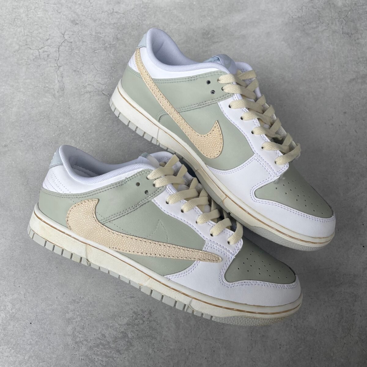 Custom Nike Dunk low painted with different green tints. OFF-WHITE swooshes and the OFF-WHITE texts on the insides. Lace strings added around the shoe for the OFF-WHITE look.