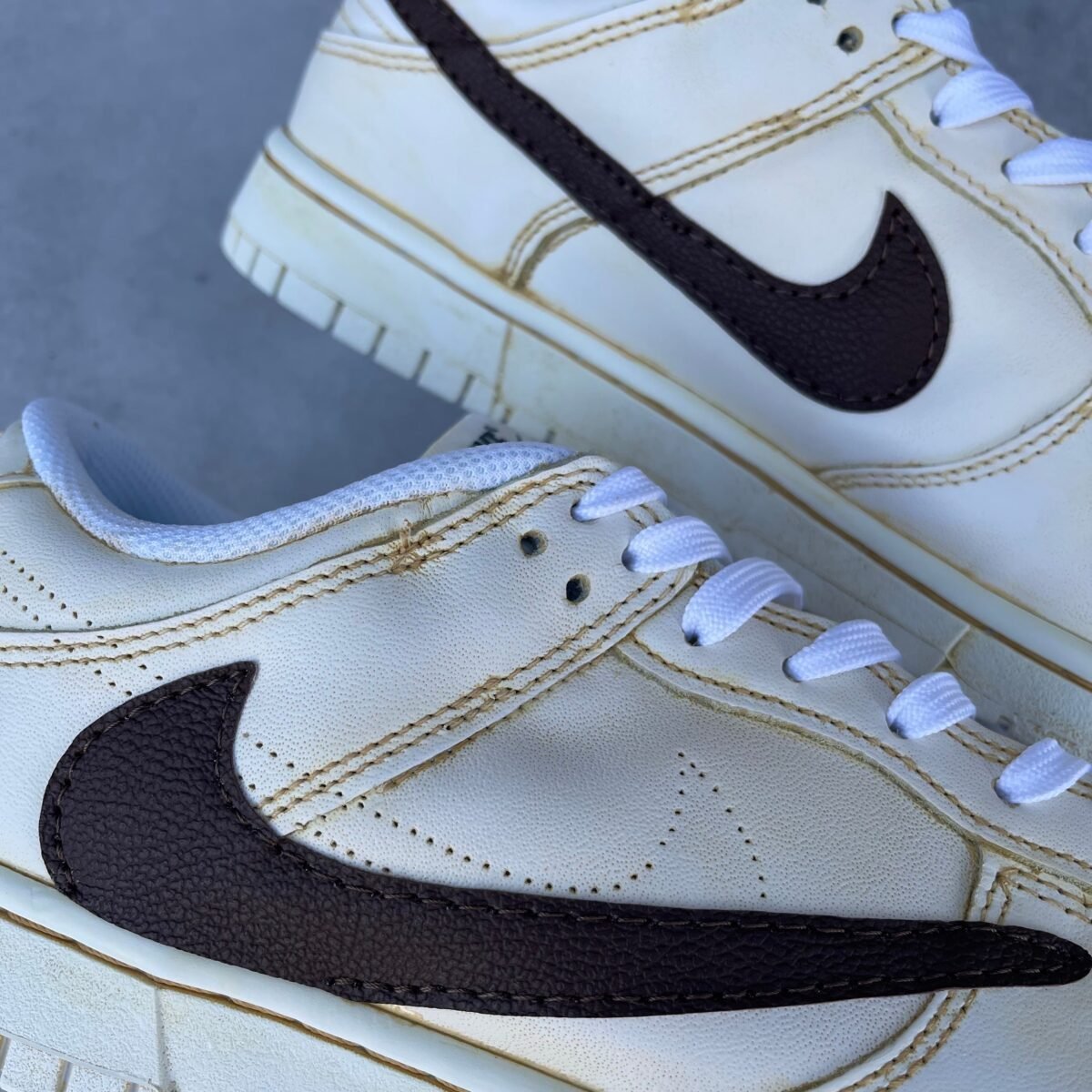 Custom Nike Dunk low fully aged out with a brown reverse swoosh.