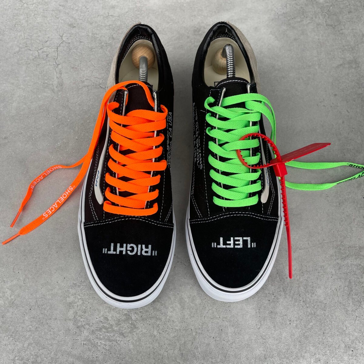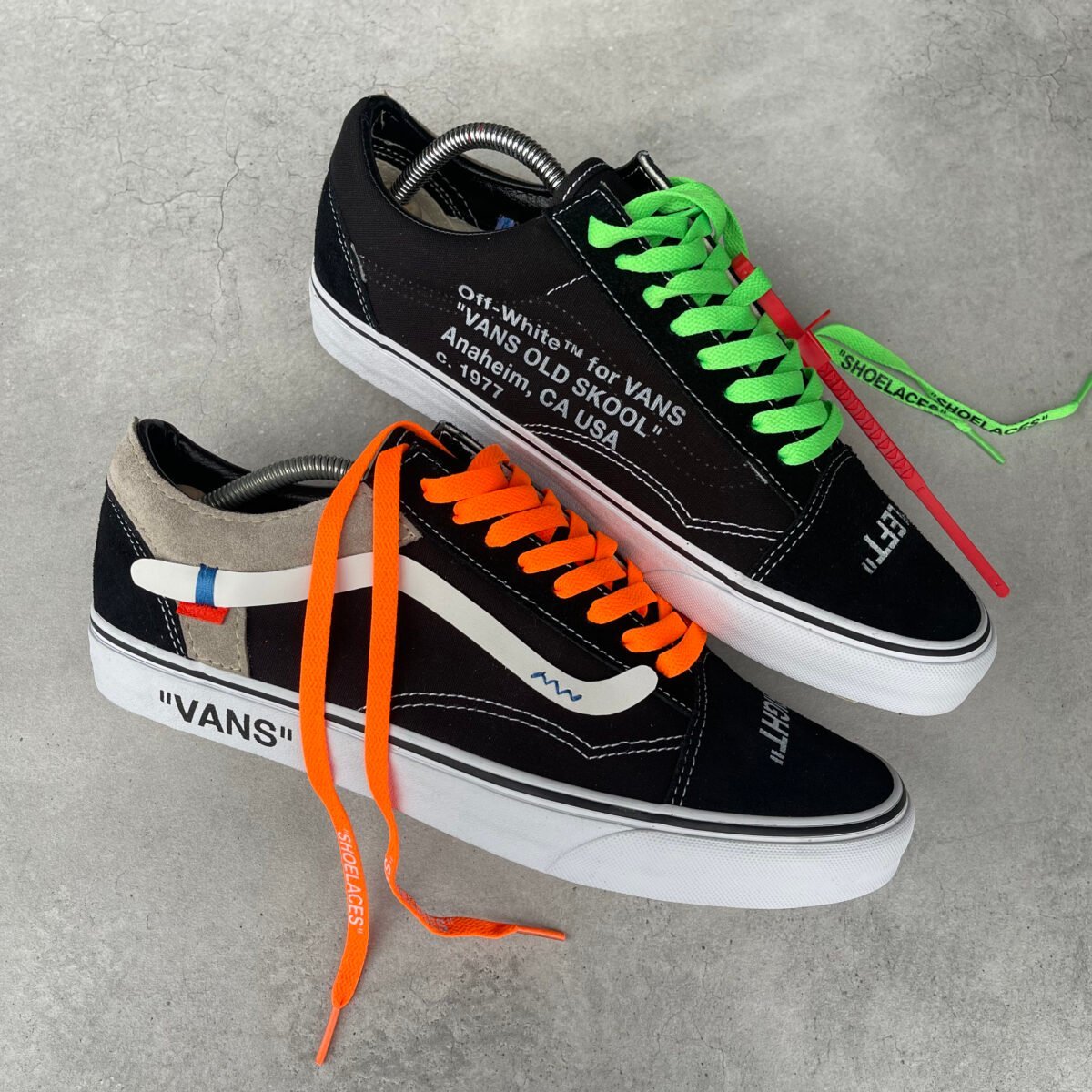 Custom Vans Old Skool white OFF WHITE. Painted with the best quality paint in the game. Scratch resistant and 100% waterproof. The Vans stripe is replaced by an OFF WHITE style stripe and stitched on the shoes.