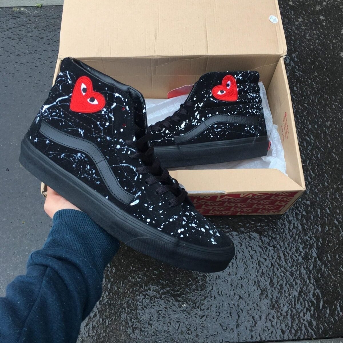 Custom Vans Sk8-hi x CDG patch splash. The patch is glued and sewn on. Painted with the best quality paint in the game. Scratch resistant and 100% waterproof