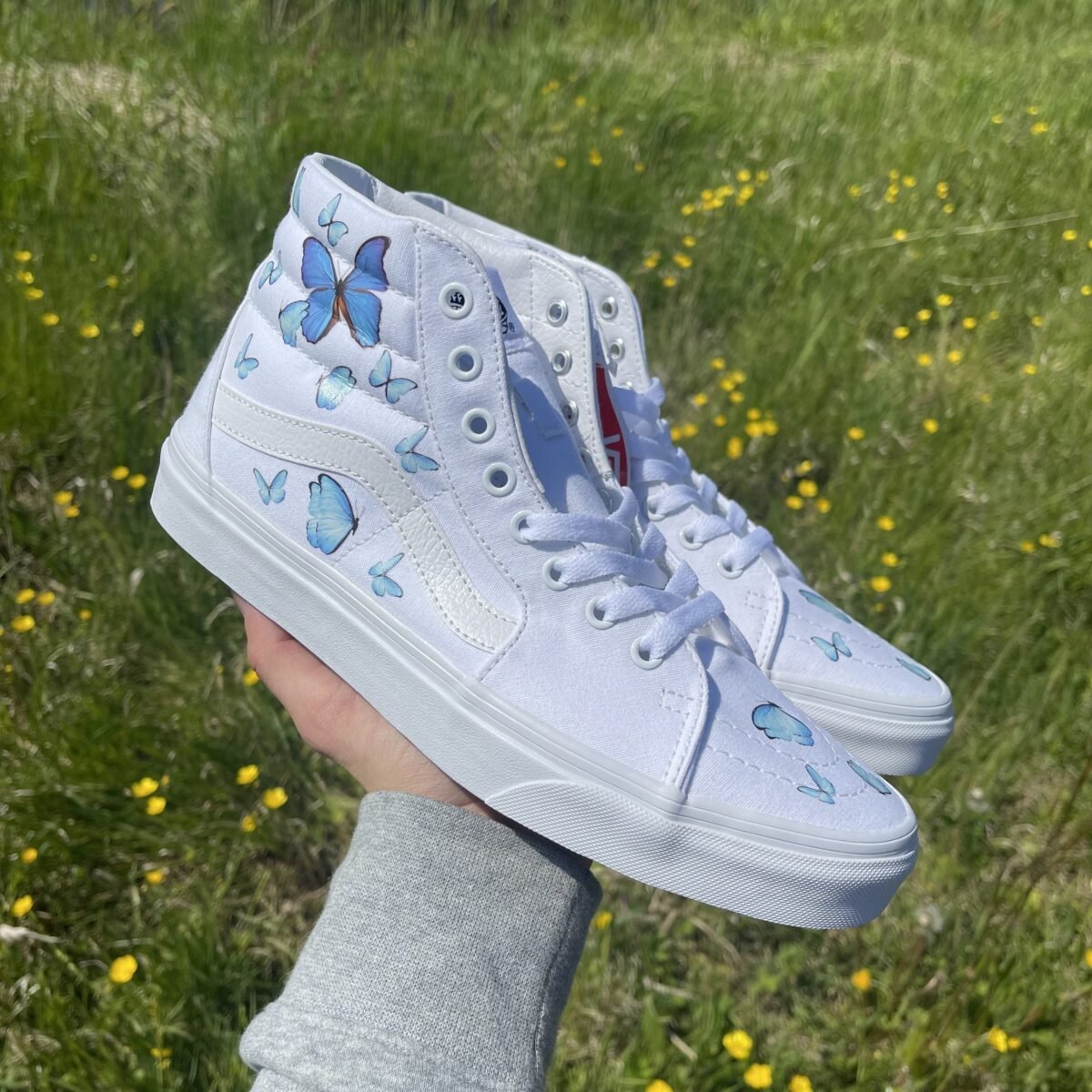 Custom Vans Sk8-hi white blue butterfly’s. Made with the best quality iron on heat transfers.