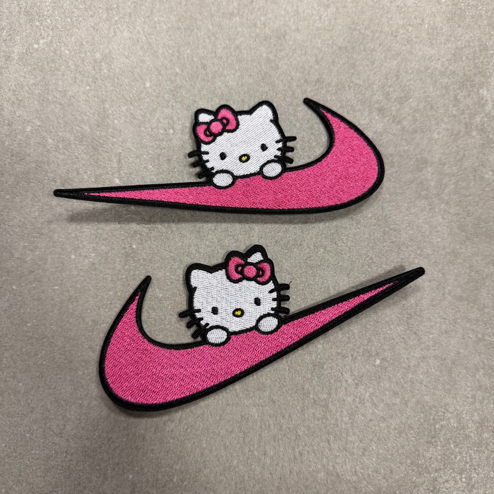 Custom made patch in a Hello Kitty swoosh style.