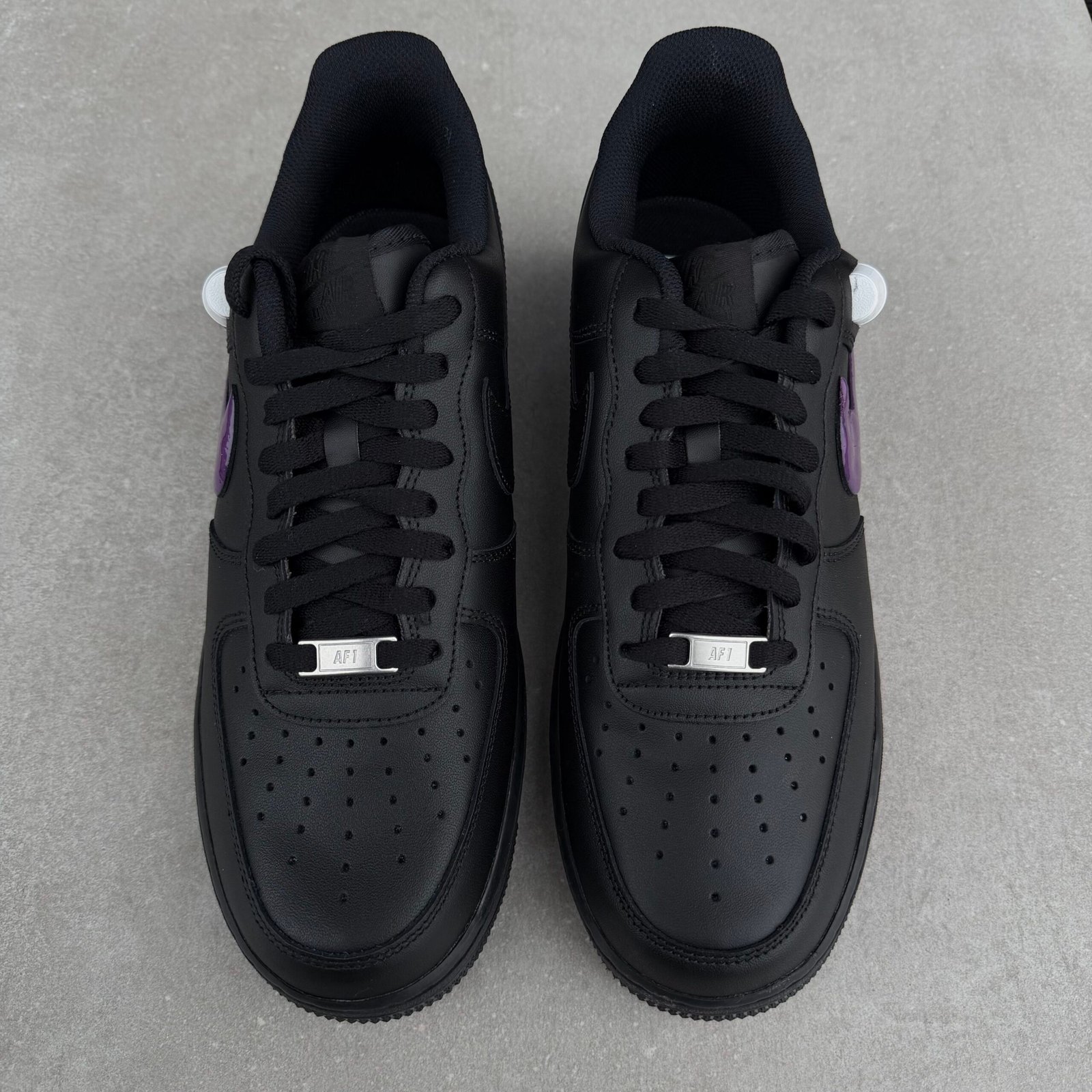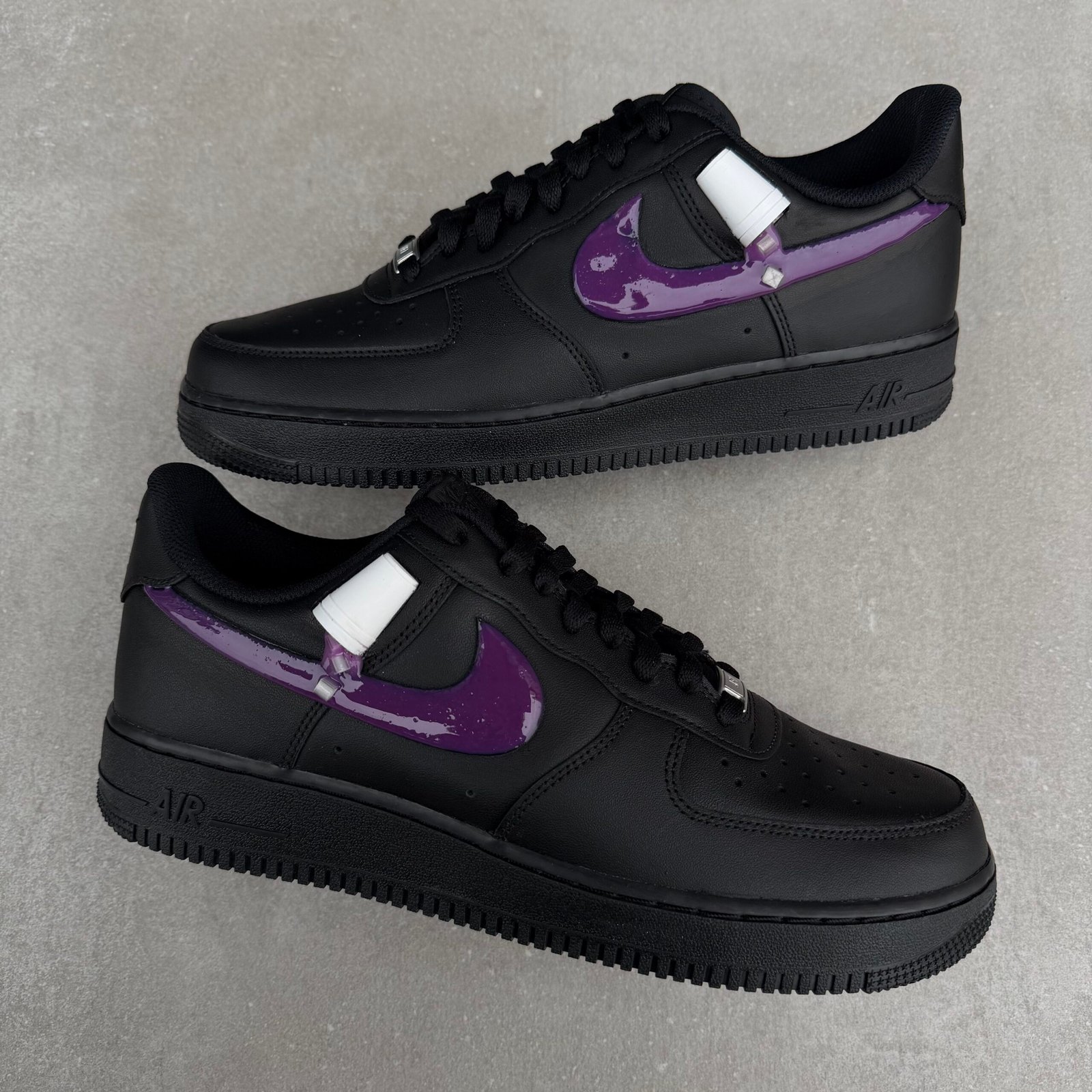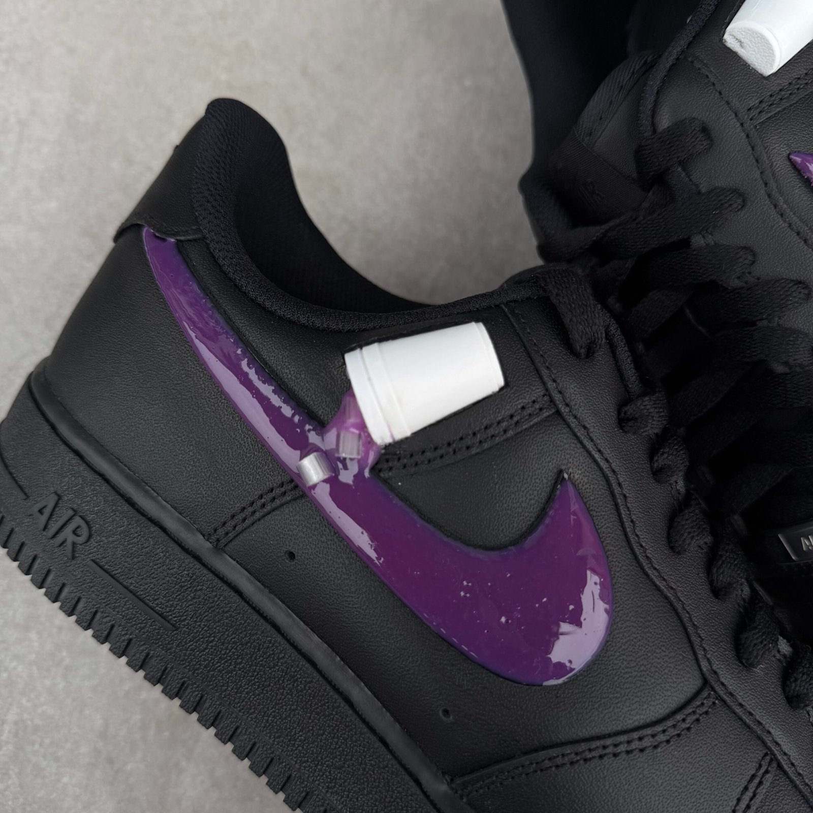Custom black Nike Air Force 1s featuring a realistic lean double cup spill, coated in high-gloss purple slime with mini ice cube details. The slime effect is fully durable and sealed, designed to last while keeping its wet, dripping look.