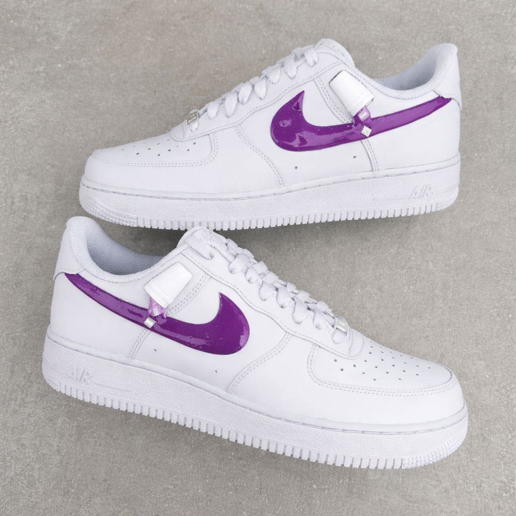 Custom white Nike Air Force 1s featuring a realistic lean double cup spill, coated in high-gloss purple slime with mini ice cube details. The slime effect is fully durable and sealed, designed to last while keeping its wet, dripping look.